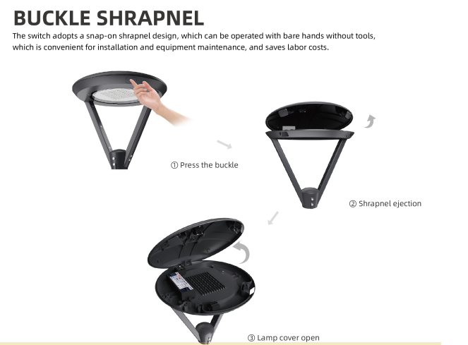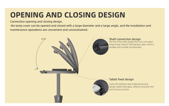Dizajn otvaranja i zatvaranja priključka, poklopac lampe se može otvoriti i zatvoriti pod velikim kutom,